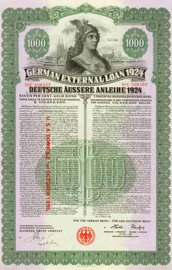 German External Loans (German: Deutsche Auslandsanleihen) are usually called German Gold Bonds or German Dollar Bonds. This bonds were issued due to the economic crisis resulting of the hyperinflation in 1923. While the issues were originating in the Dawes Plan and the Young Plan they are also named Dawes Bonds and Young Bonds.